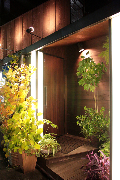 落ち着いた木目を使った入口周り。それらをこだわりの光柱の優しい光が照らし出す